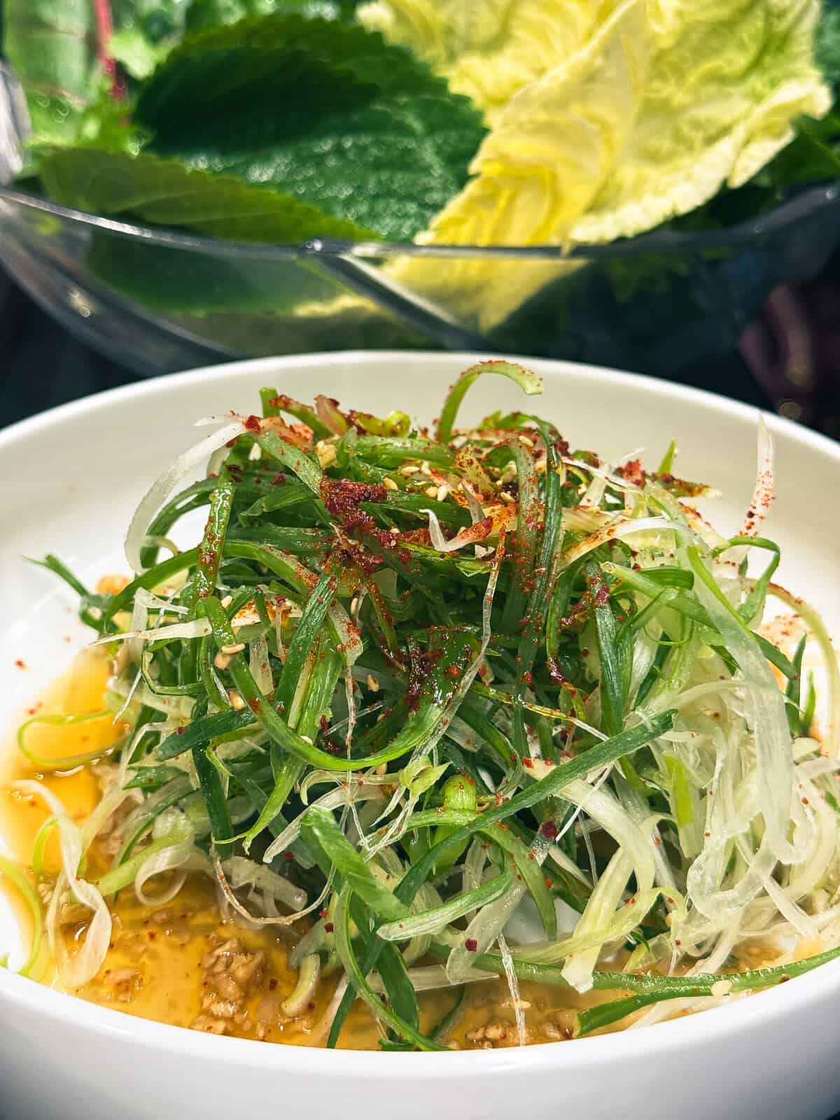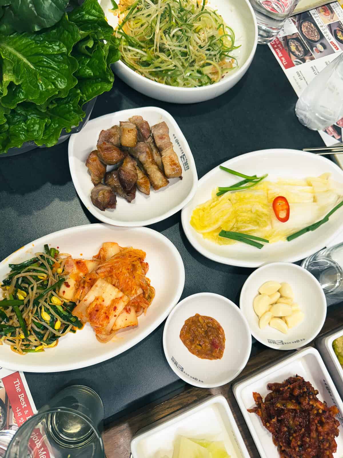 Within minutes, our table is laden with dishes of pajeon (savoury pancake), bossam (steamed pork belly), kalguksu(knife-cut noodle soup) and a variety of sides – kimchi, of course, but also raw garlic slices, saewoo jeot (fermented and salted tiny shrimp), cabbage leaves and more. The idea is to start with a cabbage leaf, layer it with pork and your chosen side dishes, then roll it up and stuff the whole thing in your mouth in one go.