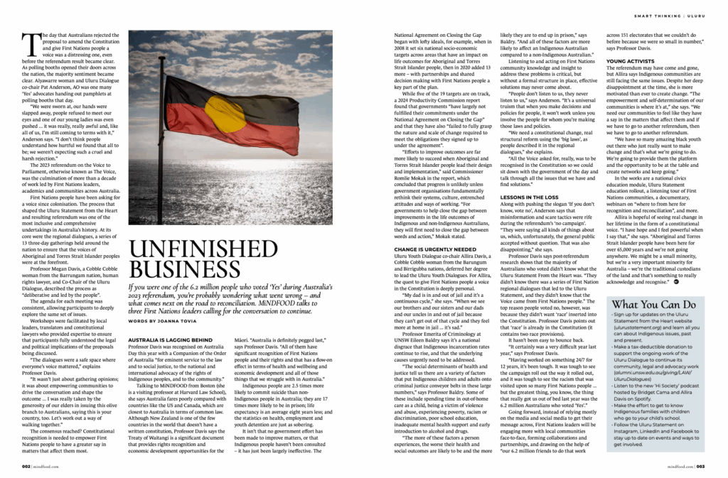 The referendum may have come and gone, but Allira says Indigenous communities are still facing the same issues. Despite her deep disappointment at the time, she is more motivated than ever to create change. “The empowerment and self-determination of our communities is where it’s at,” Allira says. “We need our communities to feel like they have a say in the matters that affect them and if we have to go to another referendum, then we have to go to another referendum.”
